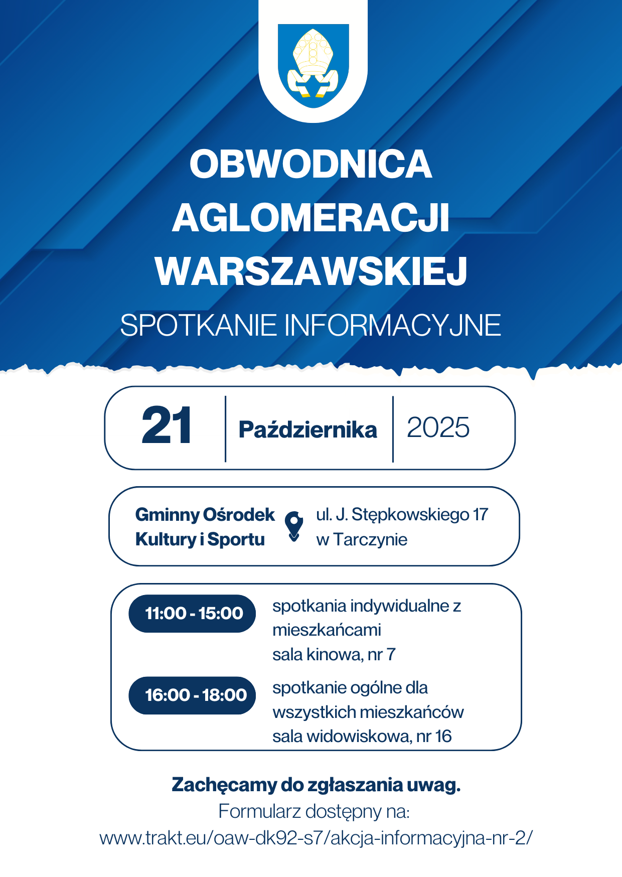 Prosimy również o obecność na spotkaniu informacyjnym, które odbędzie się 21 października 2025 r. w GOKiS w Tarczynie, ul. J. Stępkowskiego 17: