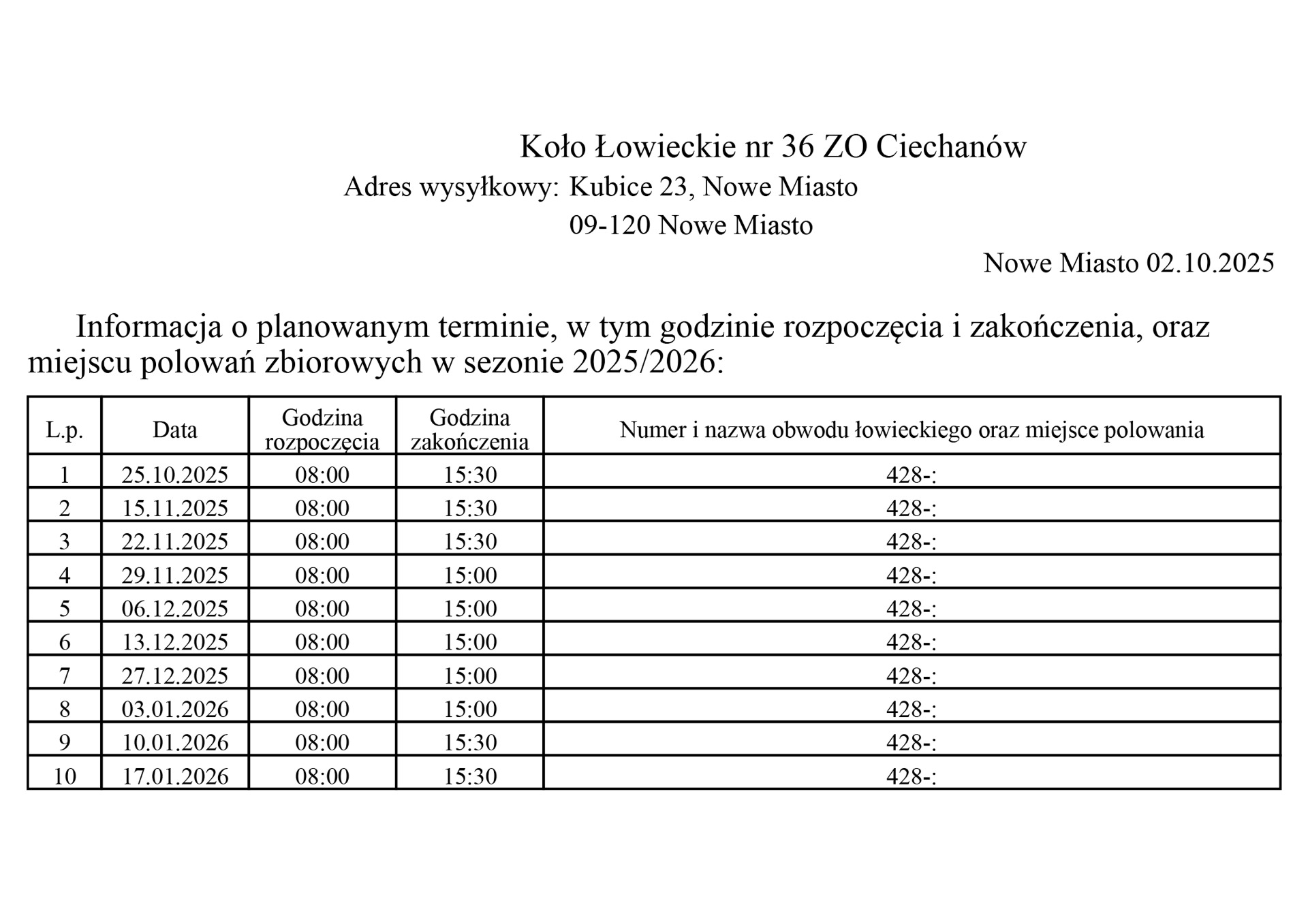 Informacja o planowanych polowaniach zbiorowych w sezonie łowieckim 2025/2026