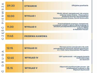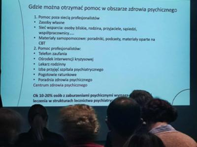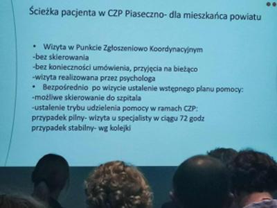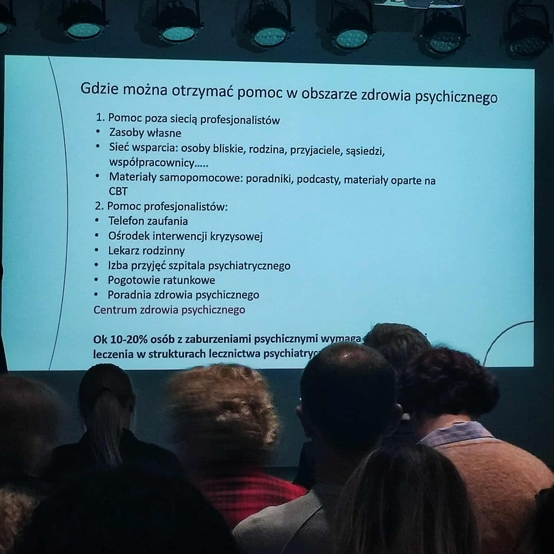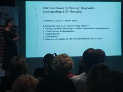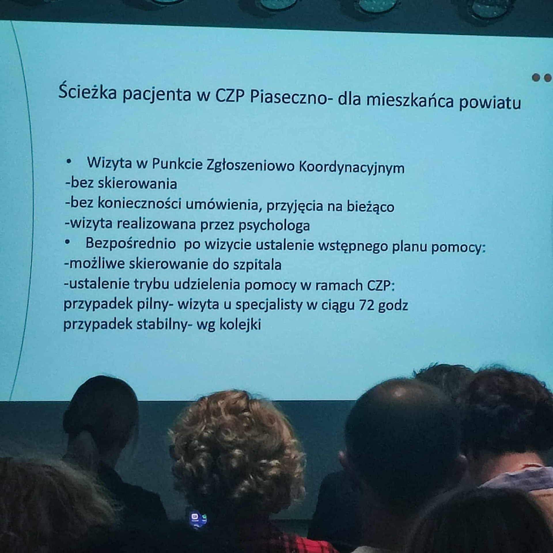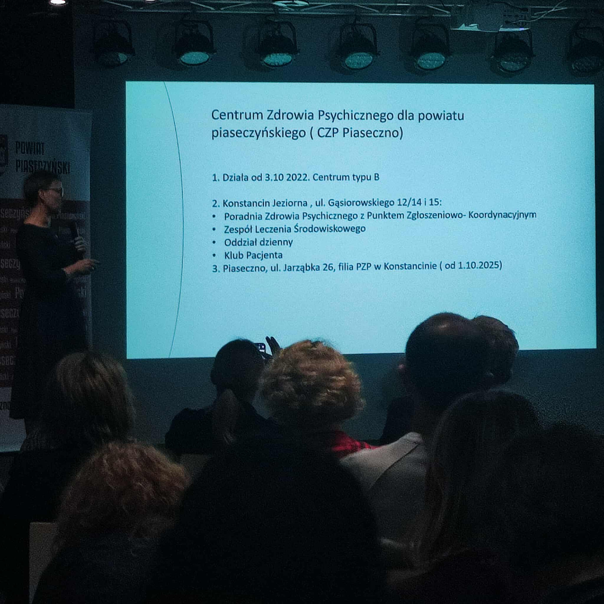 Druga część konferencji prezentowała ofertę Centrum Zdrowia Psychicznego w Piasecznie oraz przybliżyła temat pierwszej pomocy emocjonalnej dla osób potrzebujących wsparcia.