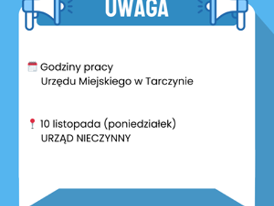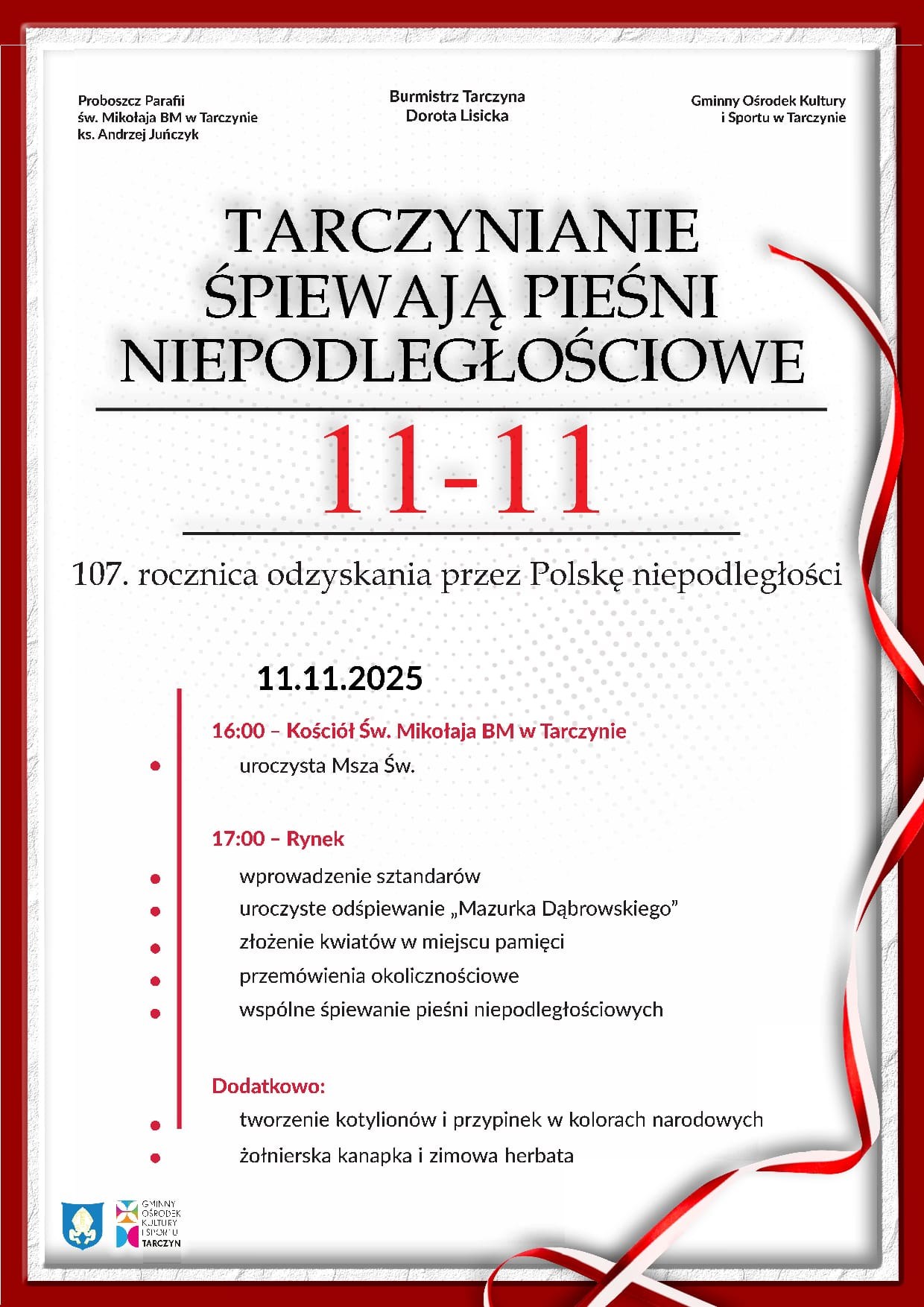 Burmistrz Tarczyna Dorota Lisicka , ks. Andrzej Juńczyk oraz Gminny Ośrodek Kultury i Sportu w Tarczynie zapraszają na wspólne obchody 107. rocznicy odzyskania niepodległości!