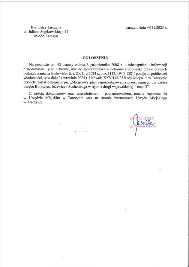 Ogłoszenie o uchwaleniu projektu miejscowego planu zagospodarowania przestrzennego dla części obrębu Borowiec, Jeżewice i Suchostruga