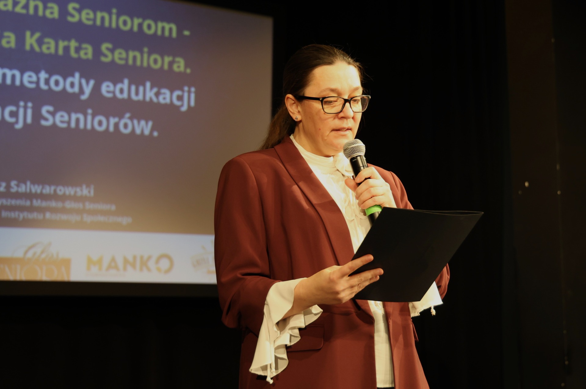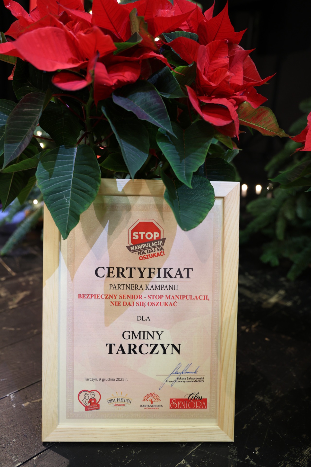 Następnie przedstawiciel Stowarzyszenia MANKO oraz ambasador „Głosu Seniora”, Marek Pilch, wręczył Pani Sekretarz certyfikaty potwierdzające dołączenie Tarczyna do programu. W swojej prelekcji „Bezpieczny Senior - Stop Manipulacji, Nie daj się oszukać!” zwrócił uwagę na codzienne zagrożenia, z którymi mogą się spotykać osoby starsze, i zaprezentował praktyczne sposoby ich unikania.