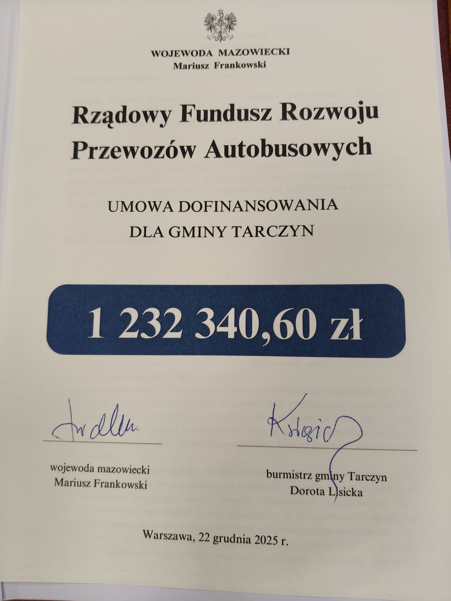 22 grudnia 2025 r. w siedzibie Mazowieckiego Urzędu Wojewódzkiego w Warszawie została podpisana umowa o dofinansowanie dla Gminy Tarczyn w ramach Funduszu Rozwoju Przewozów Autobusowych (FRPA).