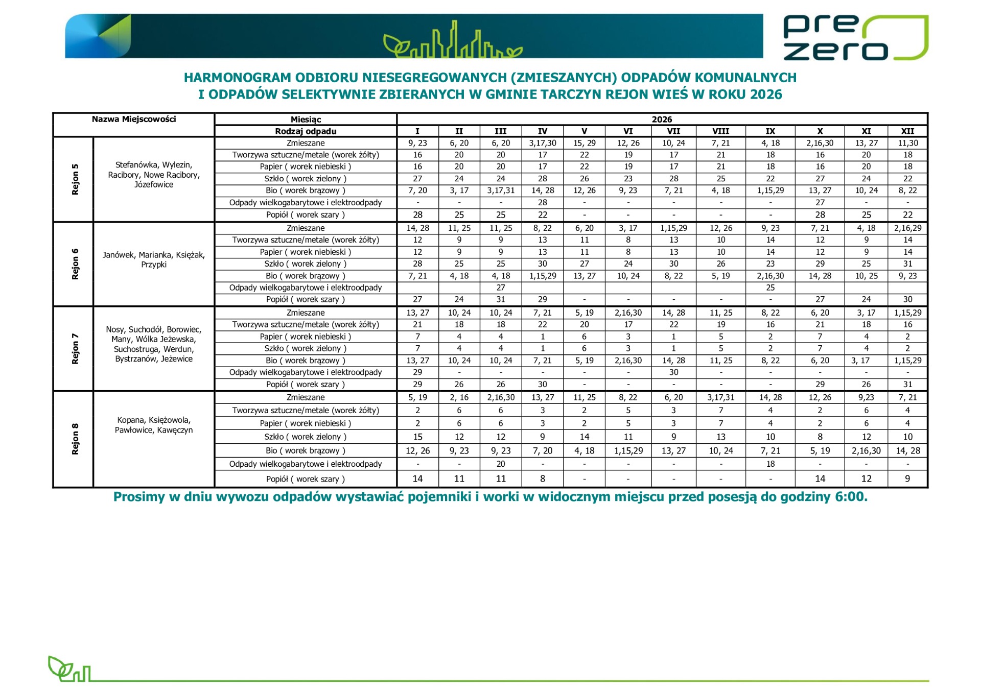 Referat Ochrony Środowiska, Gospodarki Odpadami, Rolnictwa, Wodociągów i Kanalizacji informuje, że został zaktualizowany harmonogram odbioru niesegregowanych (zmieszanych) odpadów komunalnych oraz odpadów selektywnie zbieranych. Zmiany dotyczą Gminy Tarczyn – rejon wieś, rok 2026, rejon 6. - obejmujący miejscowości: Janówek, Marianka, Księżak, Przypki.