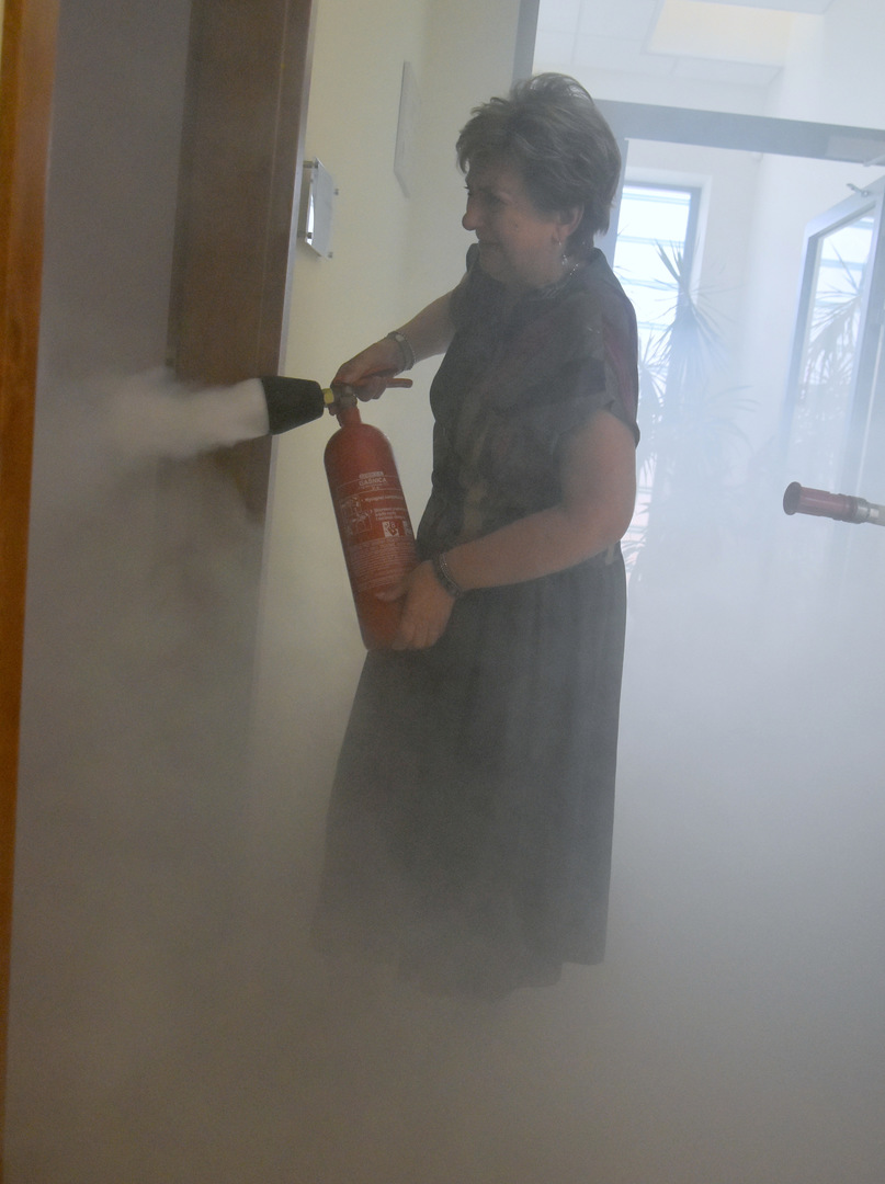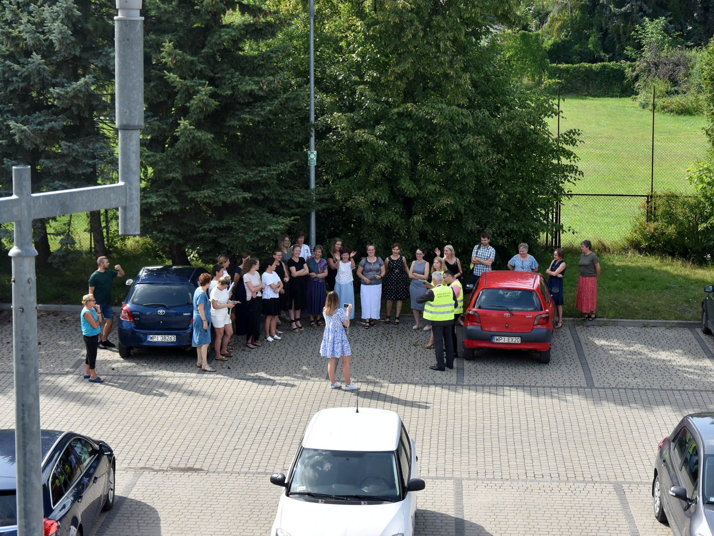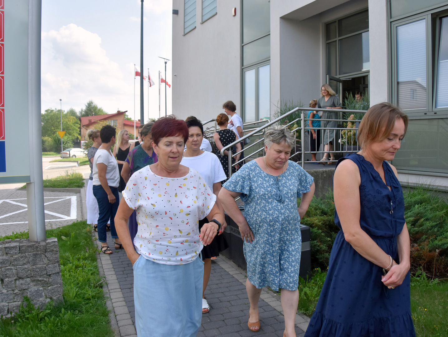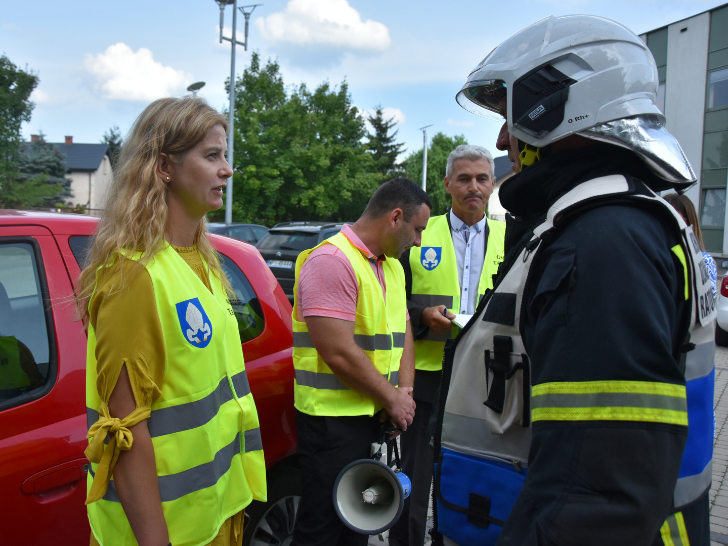 Wszyscy pracownicy zebrali się w zewnętrznym miejscu zbiórki do ewakuacji na parkingu. Wiceburmistrz sprawdziła, czy wszyscy obecni tego dnia w pracy opuścili budynek. Na miejscu pojawiła się straż pożarna – jednostka Ochotniczej Straży Pożarnej z Tarczyna, która włączyła się w działania ratowniczo-gaśnicze, przeprowadzając rozpoznanie sytuacji oraz realizując działania gaśnicze w miejscu pożaru. Symulowany pożar oczywiście ugaszono i pracownicy mogli powrócić do pracy.