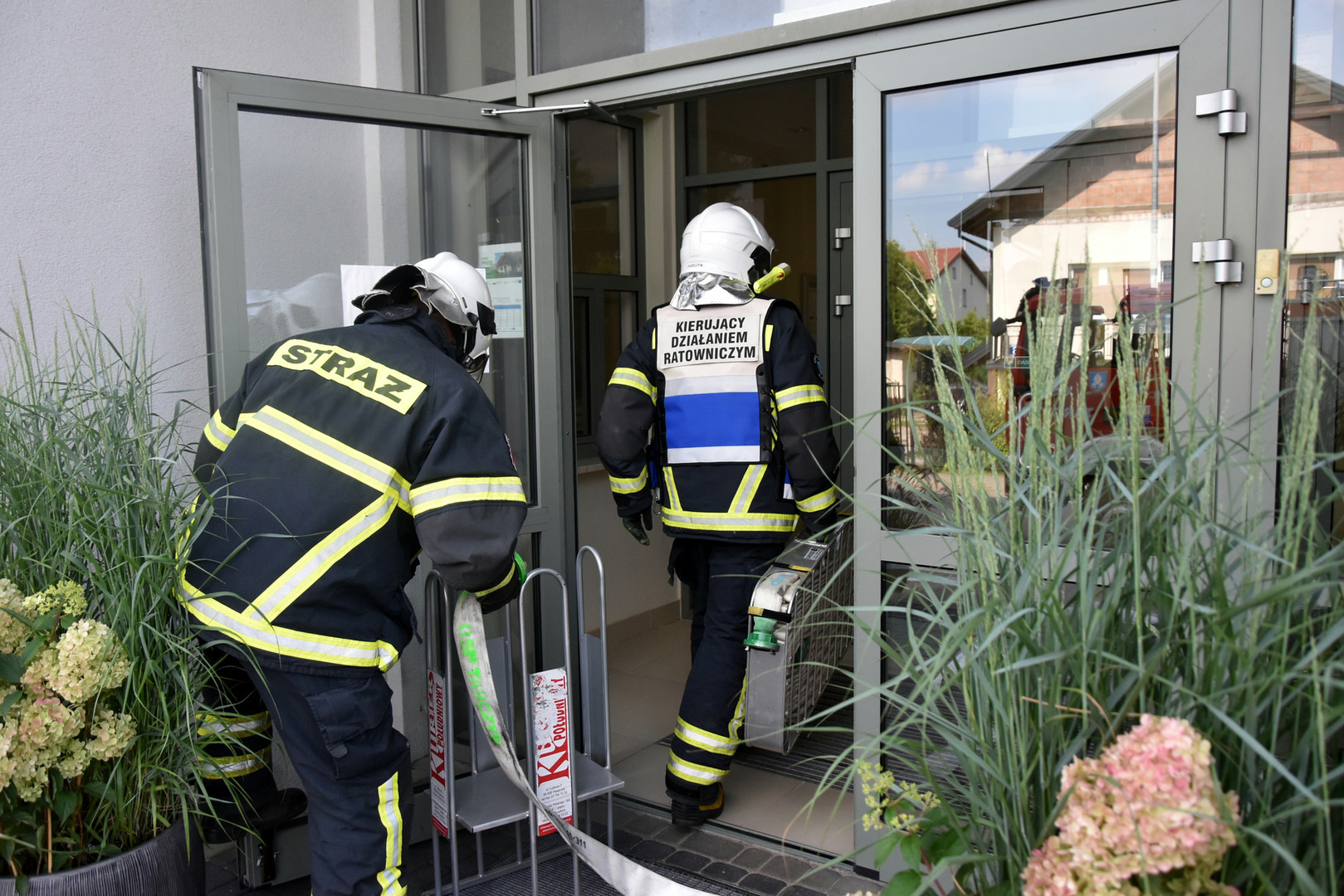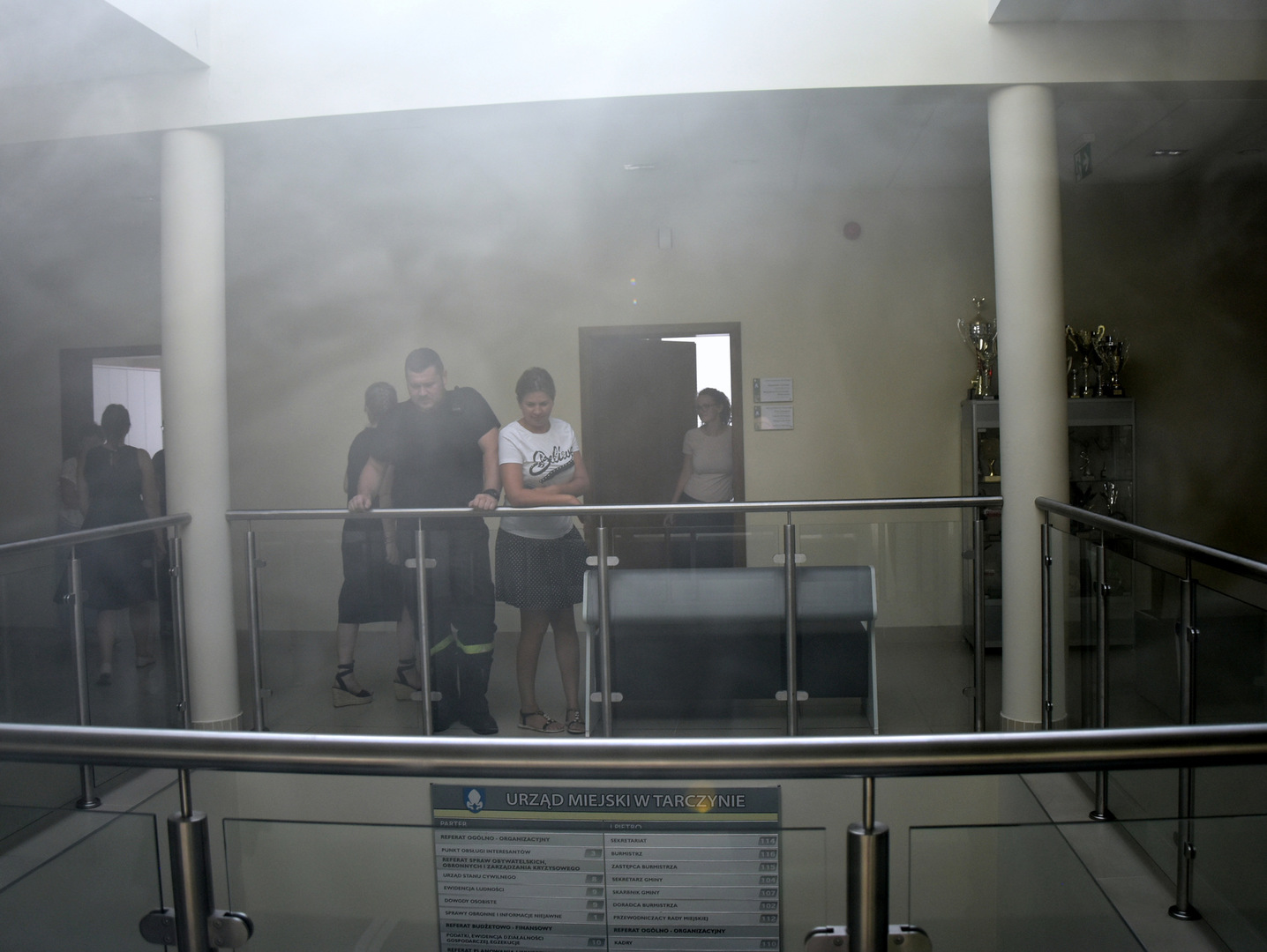 O godzinie 15.00 w pomieszczeniu biurowym na I piętrze powstało zadymienie – pożar wyposażenia biurowego, cały pokój w dużym zadymieniu. System sygnalizacji pożaru poinformował pracownika kancelarii urzędu, który po zlokalizowaniu w centralce pożarowej miejsca pożaru, udał się na miejsce zdarzenia. Nie był to alarm fałszywy. Stwierdzono silne zadymienie w jednym z pokoi biurowych na piętrze.