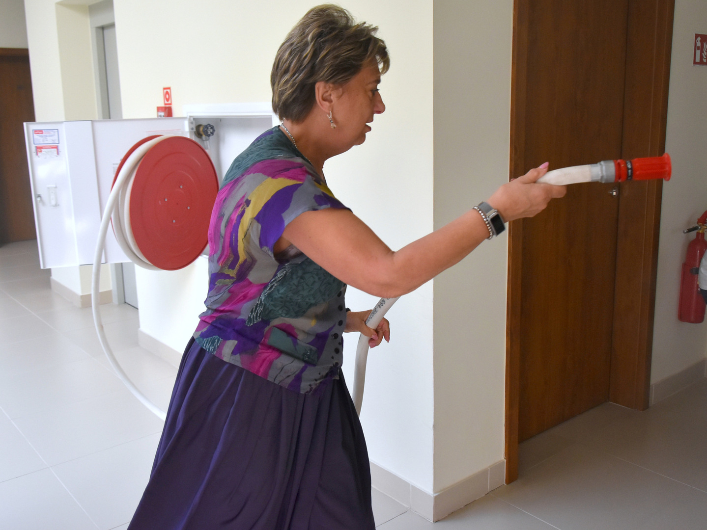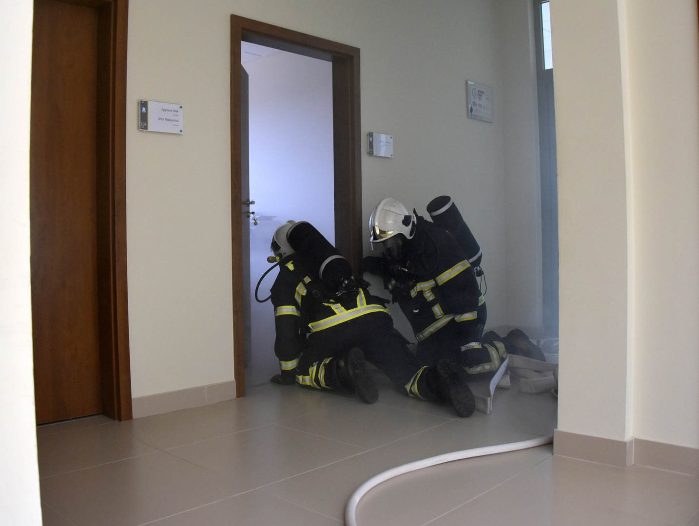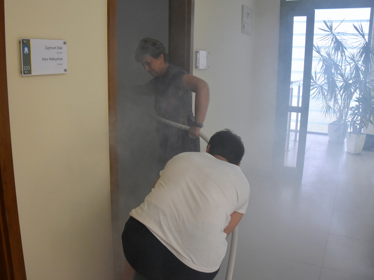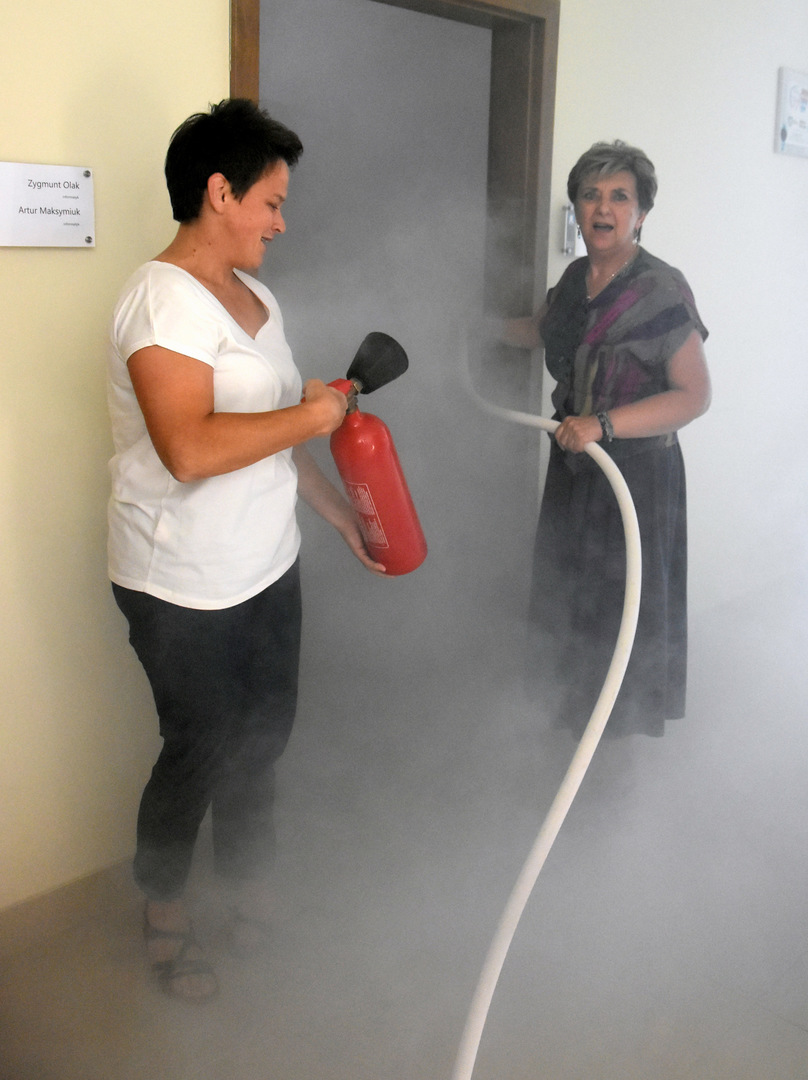 Podjęto bezpieczną próbę gaszenia pożaru przy użyciu gaśnicy oraz hydrantu (dwie osoby sprawnie przystąpiły do gaszenia). Ze względu na silne zadymienie i bezpieczeństwo – odstąpiono od dalszych działań gaśniczych. Zaalarmowana o zdarzeniu Wiceburmistrz Małgorzata Nowaczyńska, po zapoznaniu się z sytuacją - podjęła decyzję o ewakuacji urzędu. Poinformowała telefonicznie (aplikacyjnie) Straż Pożarną oraz wydała polecenie ogłoszenia ewakuacji przy użyciu tuby nagłaśniającej.