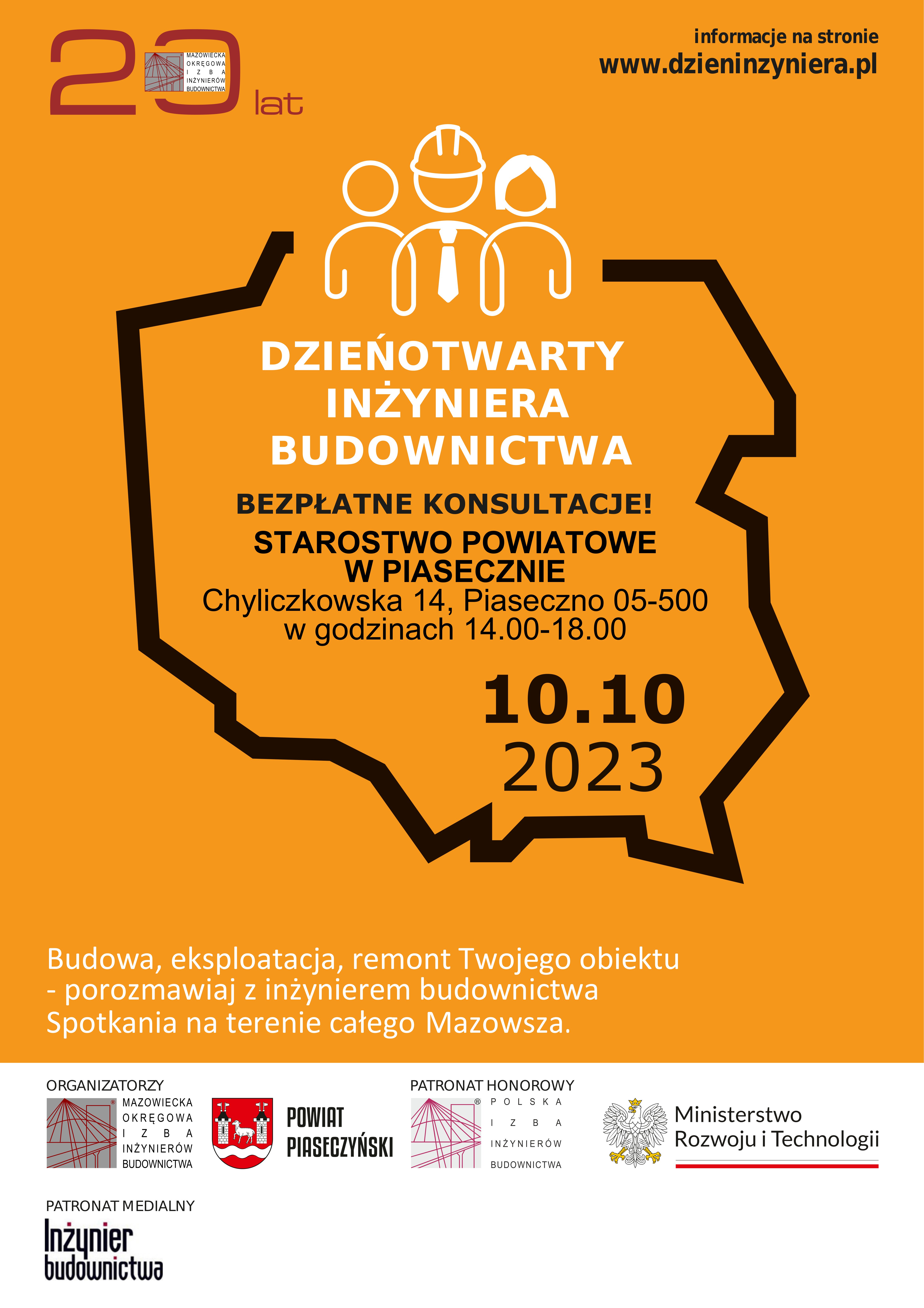 Dzień Otwarty Inżynierów Budownictwa zostanie zorganizowany 10 października. Bezpłatne konsultacje zostaną przeprowadzone w godzinach 14 -18 w Starostwie Powiatowym w Piasecznie, przy ul. Chyliczkowskiej 14.